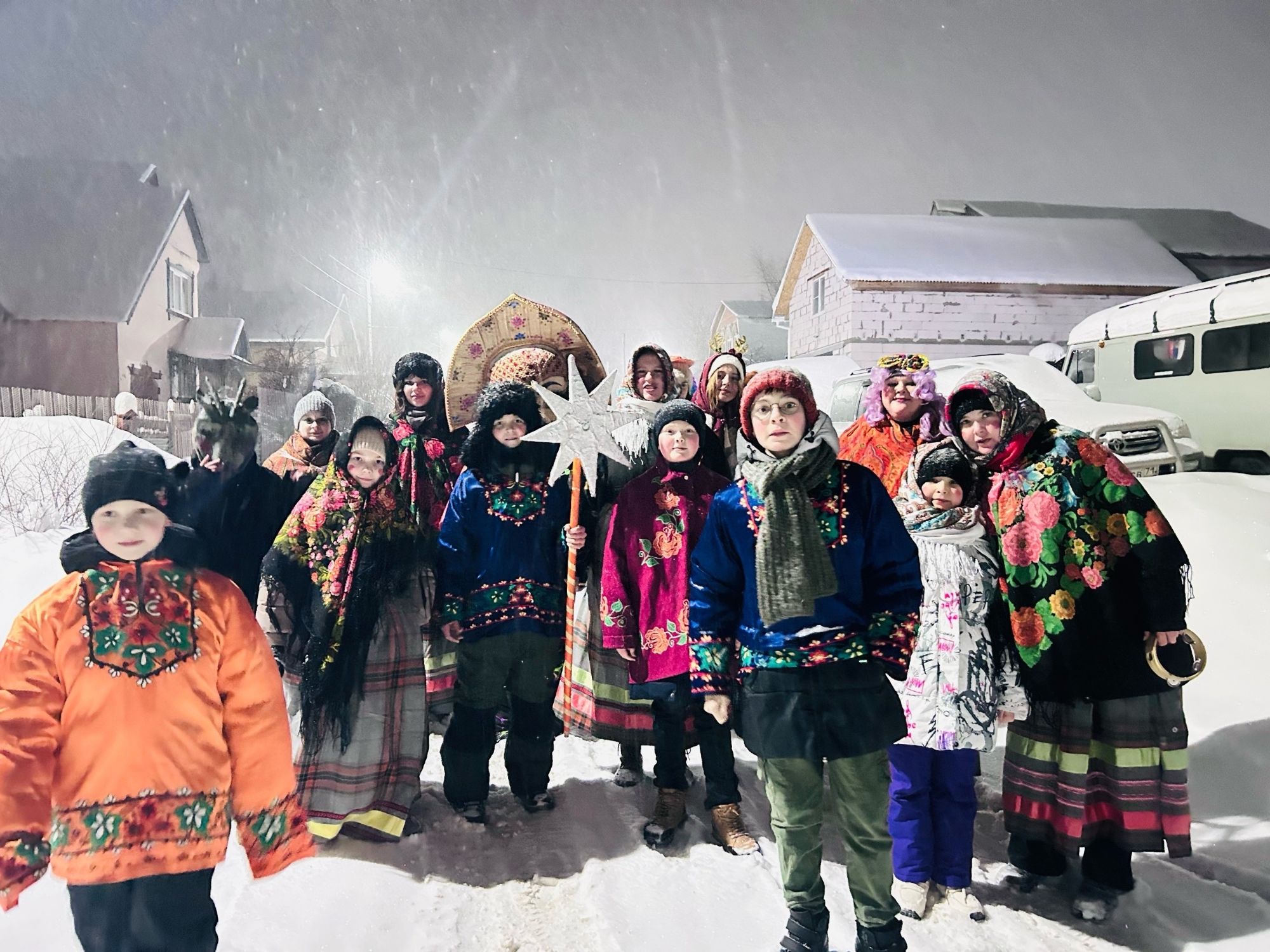 Участники прошли по посёлку со святочными песнями и поздравили жителей с Рождеством, пожелав мира, добра и счастья. В ответ люди щедро угощали колядующих пирогами и конфетами и приглашали заходить в дома