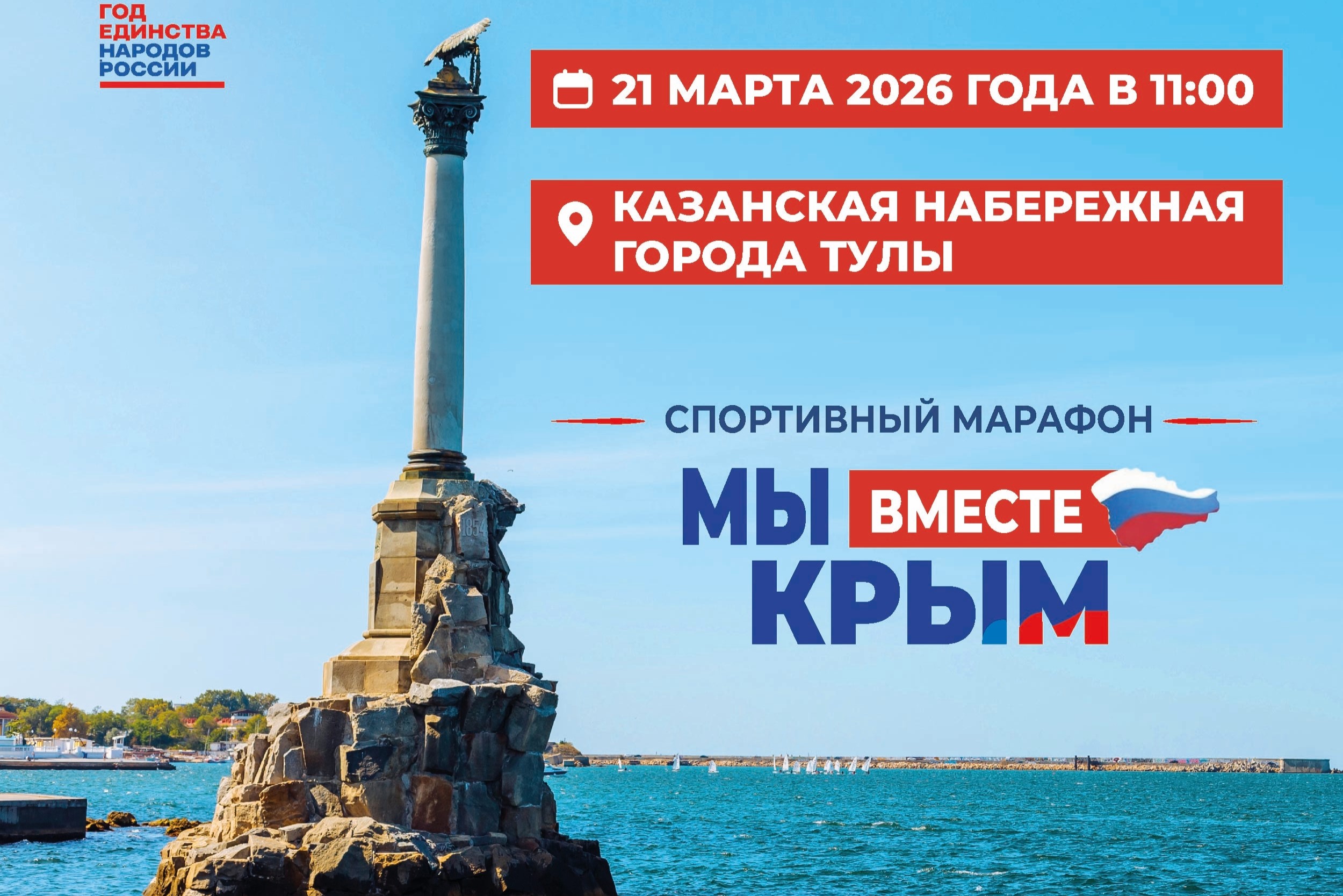 21 марта в 11.00 на Казанской набережной Тулы пройдет спортивный марафон «Мы вместе Крым». Мероприятие приурочено к 12-й годовщине воссоединения Крыма и Севастополя с Россией