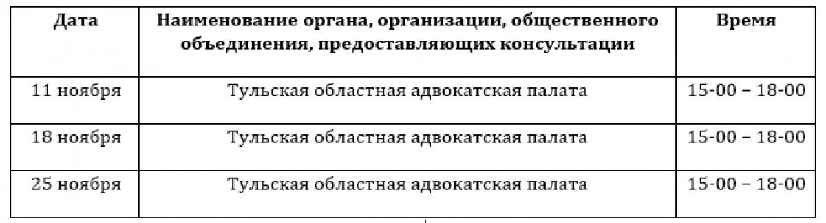 График предоставления Тульским региональным отделением Общероссийской общественной организации «Ассоциация юристов России» юридических консультаций в Правительстве Тульской области на ноябрь 2025 года