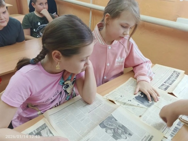 Ребята вместе с Еленой Николаевной рассмотрели выпуски газеты 20-летней и 30-летней давности, увидели на страницах фото родных или знакомых людей. Почитали статьи про нашу школу и деревню.